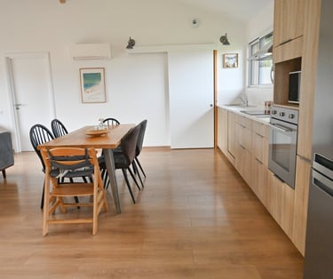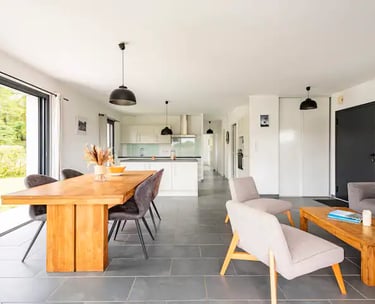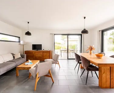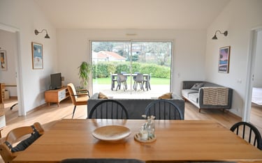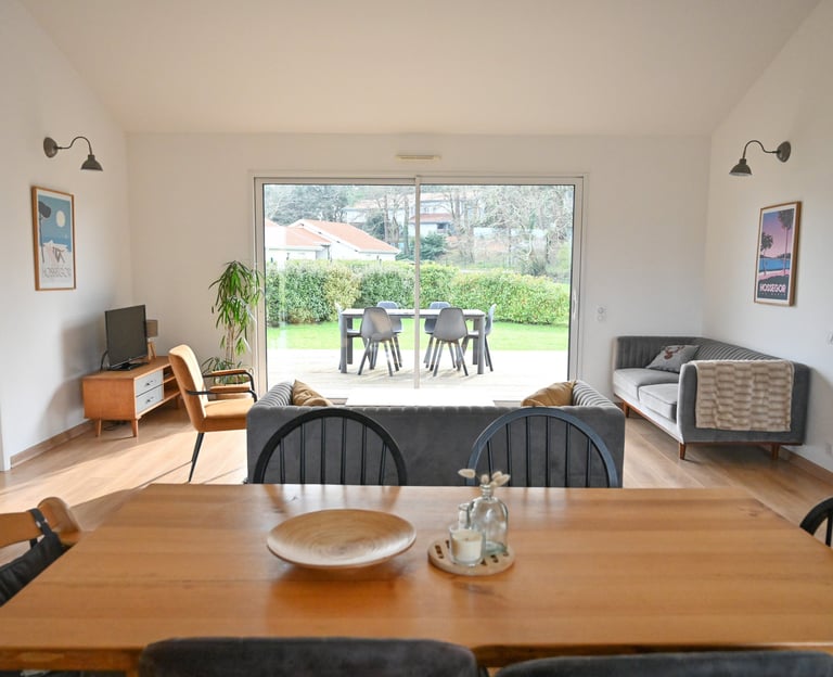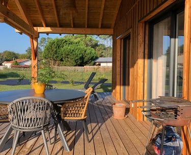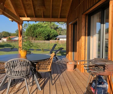 Maison bois de 92m2 pouvant accueillir jusqu'à 5 personnes, avec grande terrasse bois et accès direct à la piste cyclable.
