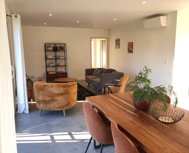 chauffage, climatisation, TV, internet, cuisine entièrement équipée, 2 chambres, 1 bureau, 2 salle d'eaux, 2 WC, lave-linge, sèche-linge